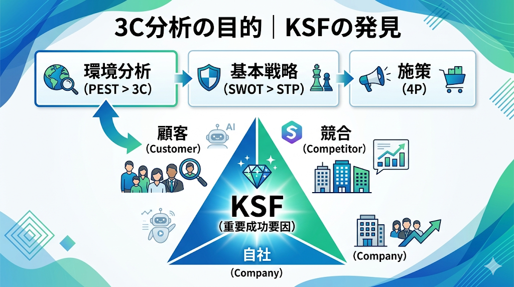 法律改正やAI技術の進化といった「空(マクロ環境)」の動きを、自社の「地面(事業環境)」のレベルまで落とし込むのが3C分析の役割です。 - SWOT分析への橋渡し