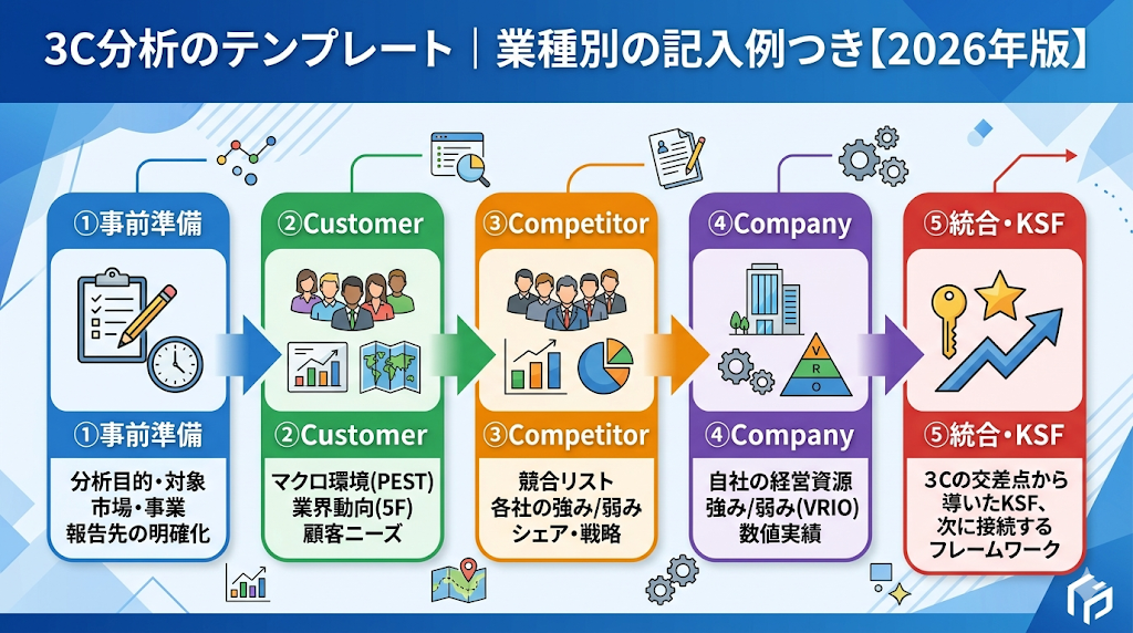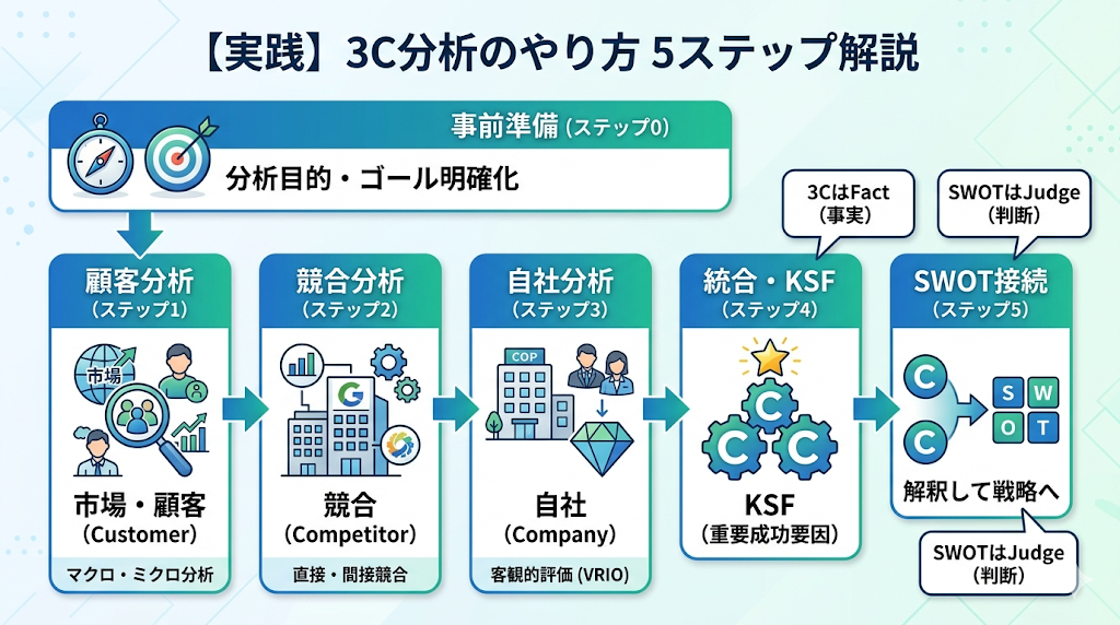 3C分析は「事前準備→顧客分析→競合分析→自社分析→統合・戦略接続」の5ステップで進めます。
