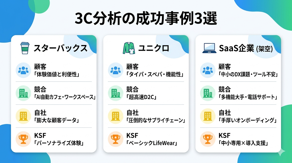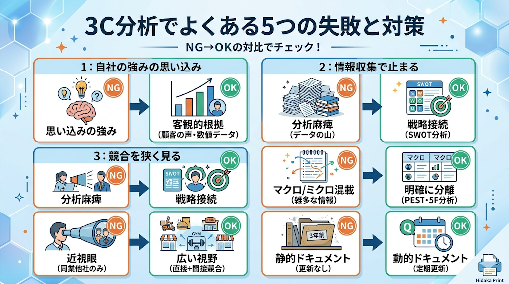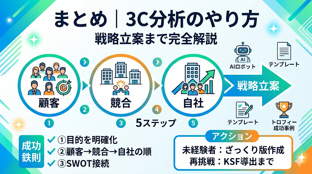 この記事では、3C分析のやり方を5ステップで解説し、業種別のテンプレート記入例、よくある失敗と対策、他フレームワークとの使い分け、成功事例、AI活用法まで網羅してきました。