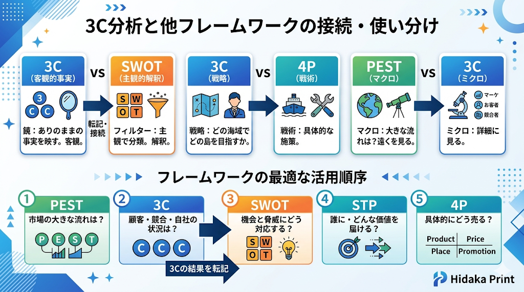 3C分析は、単独で完結するものではなく、前後のフレームワークと密接に連動します。