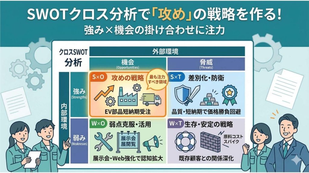 その後、クロスSWOT分析で「強み×機会」を中心に戦略を検討しましょう。