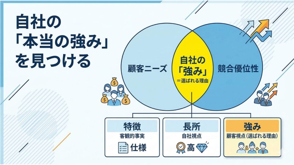 単に優れている点や得意分野を指すのではなく、「顧客が求める価値」と「競合にない優位性」が重なるポイントが、本当の意味での強みとなります。