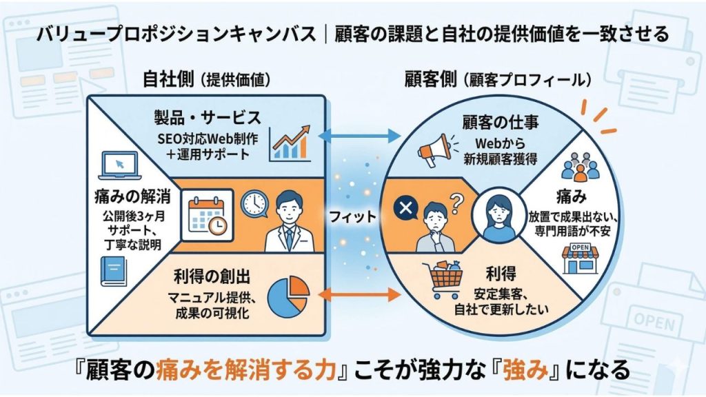 この記事で紹介した4つのステップ(顧客ヒアリング → 社内ヒアリング → 競合比較 → 市場俯瞰)とフレームワーク(3C分析・SWOT分析・VRIO分析・バリュープロポジションキャンバス)を組み合わせれば、「なんとなくの自信」を「根拠のある強み」に変えることができます。