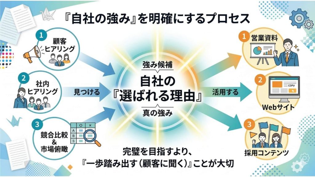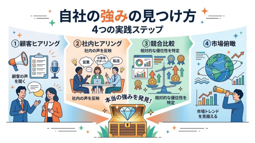 自社の強みを見つけるには、「顧客ヒアリング → 社内ヒアリング → 競合比較 → 市場俯瞰」の4ステップで進めるのが効果的です。