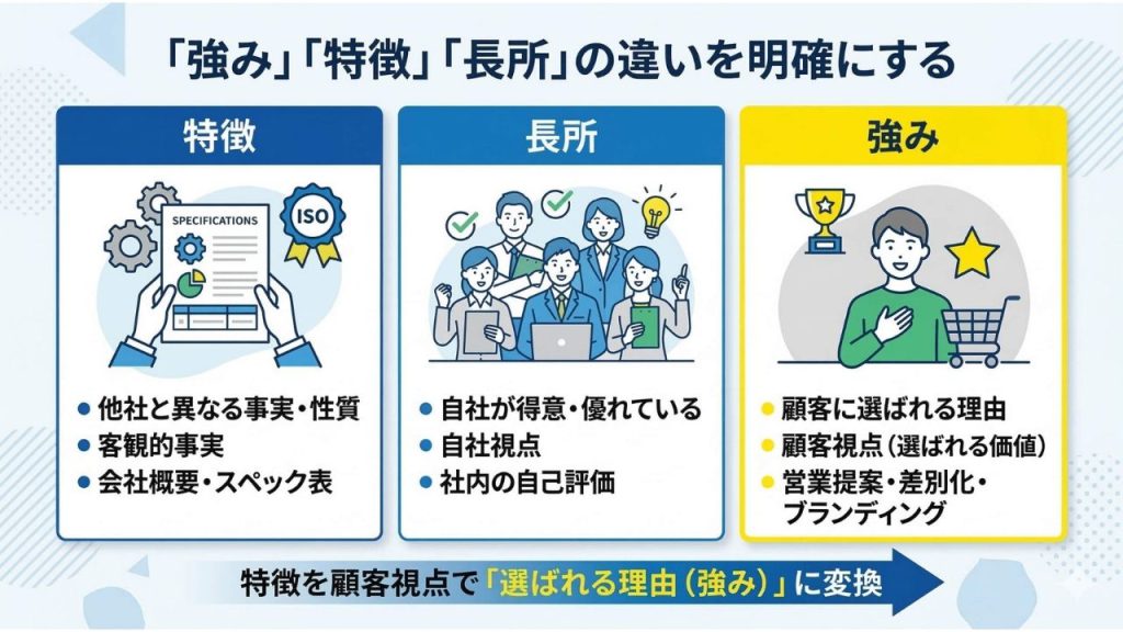 自社の強みとは?正しい定義と「特徴」「長所」との違い