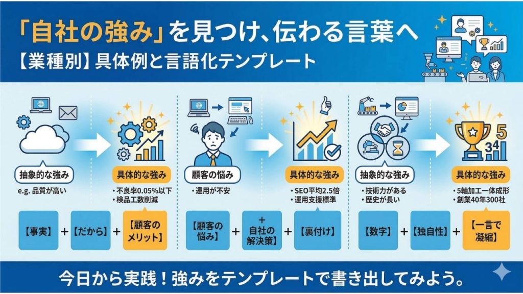 そして見つけた強みは、言語化テンプレートを使って「事実+だから+顧客のメリット」の構造で表現し、営業資料・Webサイト・採用コンテンツなど、あらゆる顧客接点に反映させましょう。
