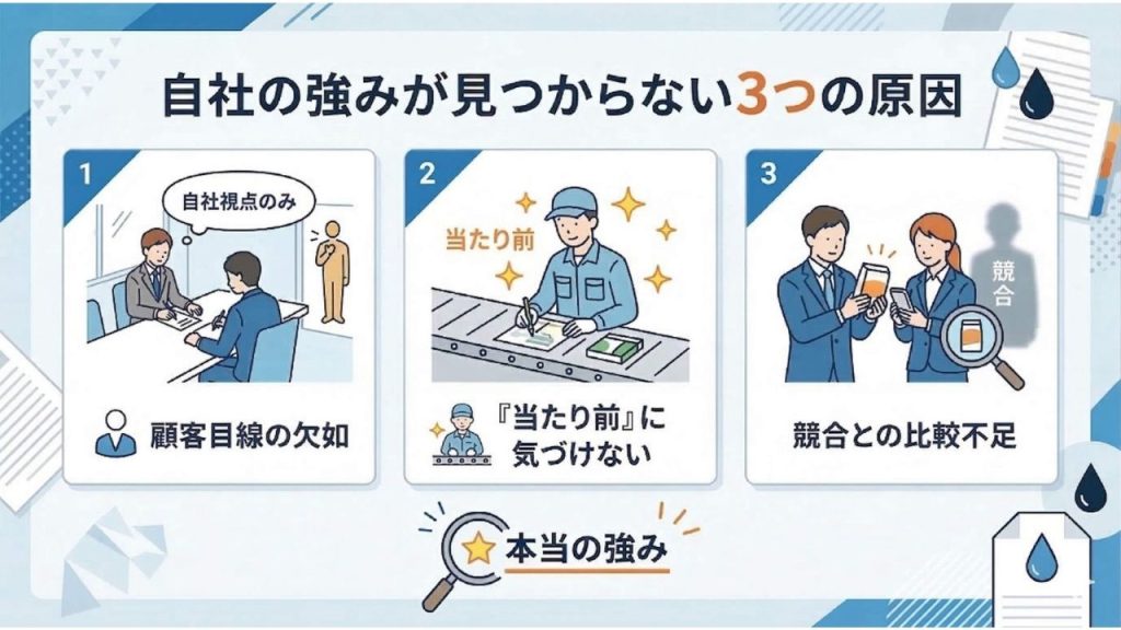 最も多い原因が、社内の会議室だけで強みを議論してしまうことです。