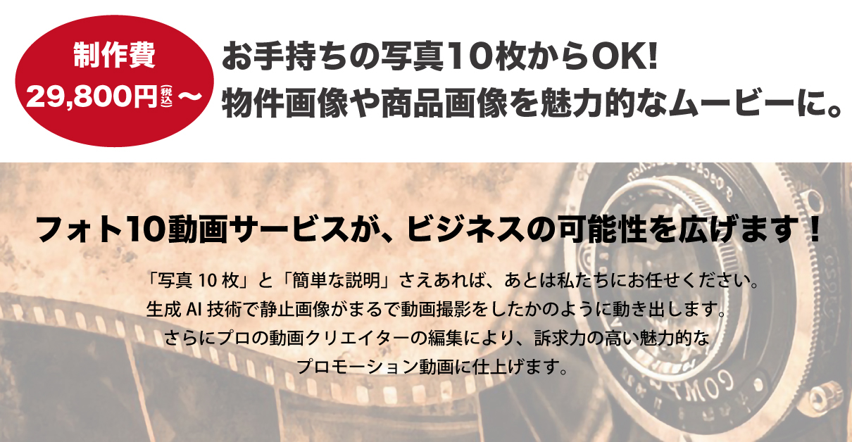 | フォト10動画プラン | 10枚 | 約1分 | 29,800円(税込) |